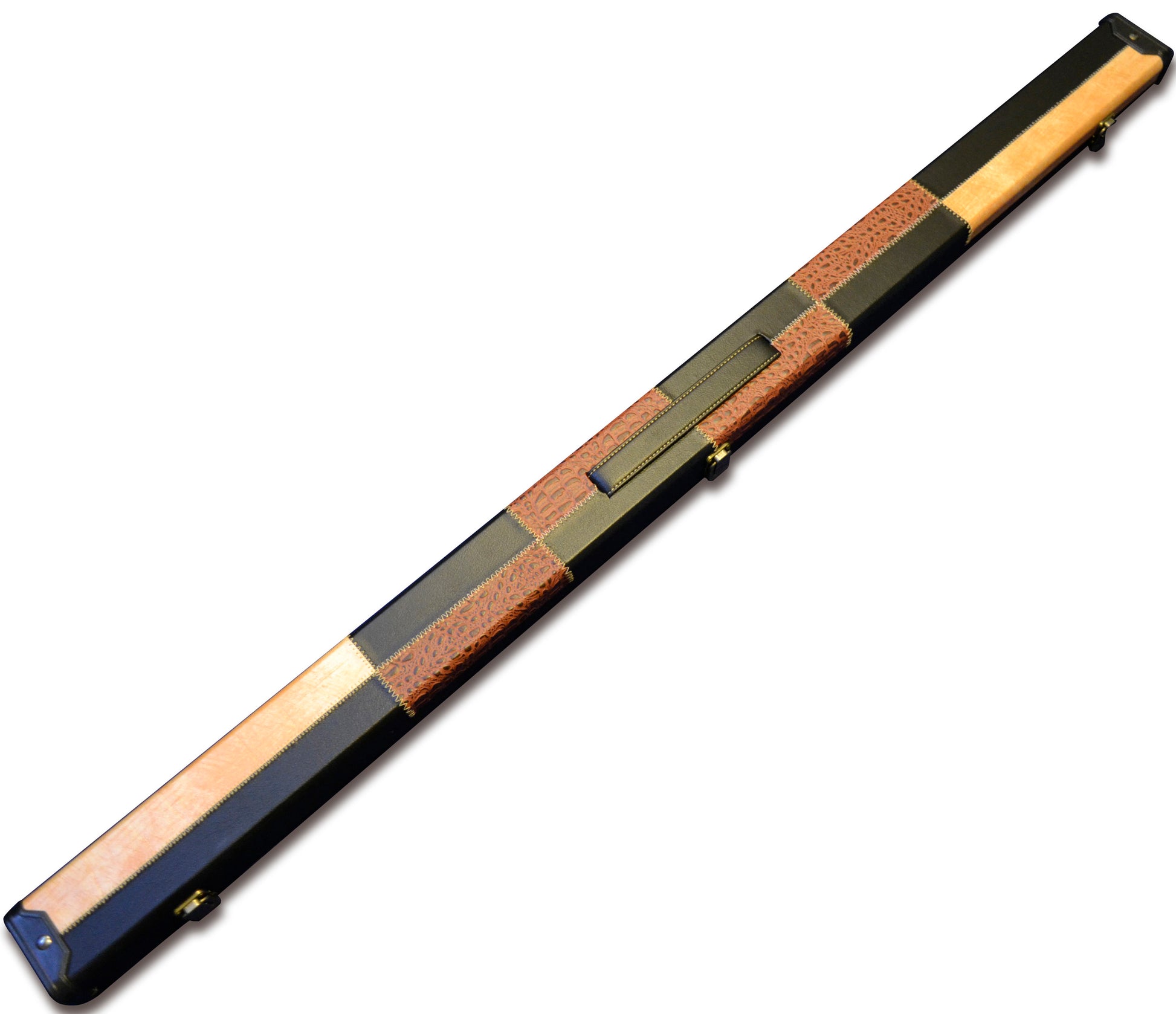 The Stitched Patchwork Case Comes With A Suede Interior, A Seperate Chalk Pocket And Has Brass Catches And The Traditional Riveted End Caps