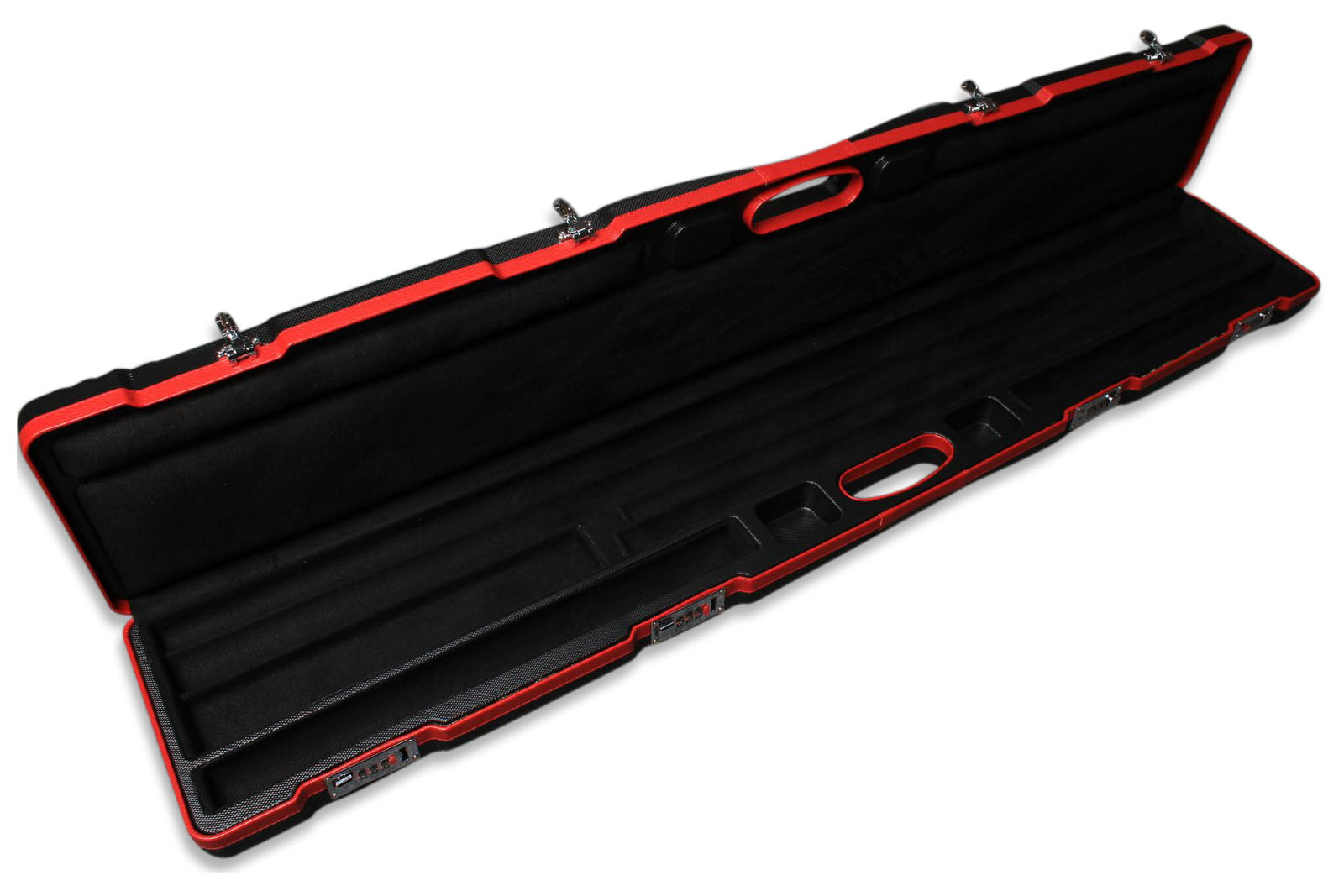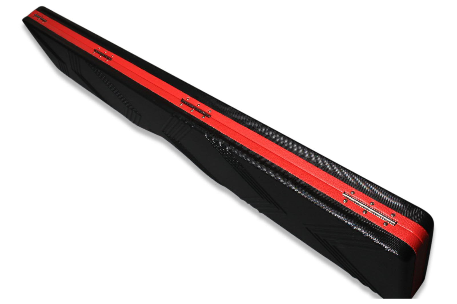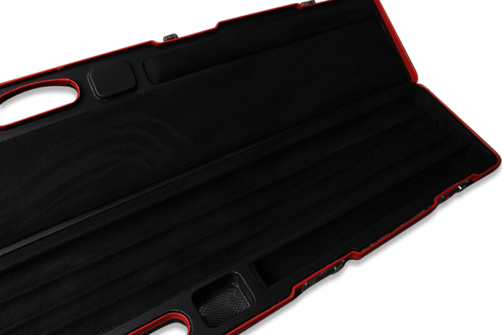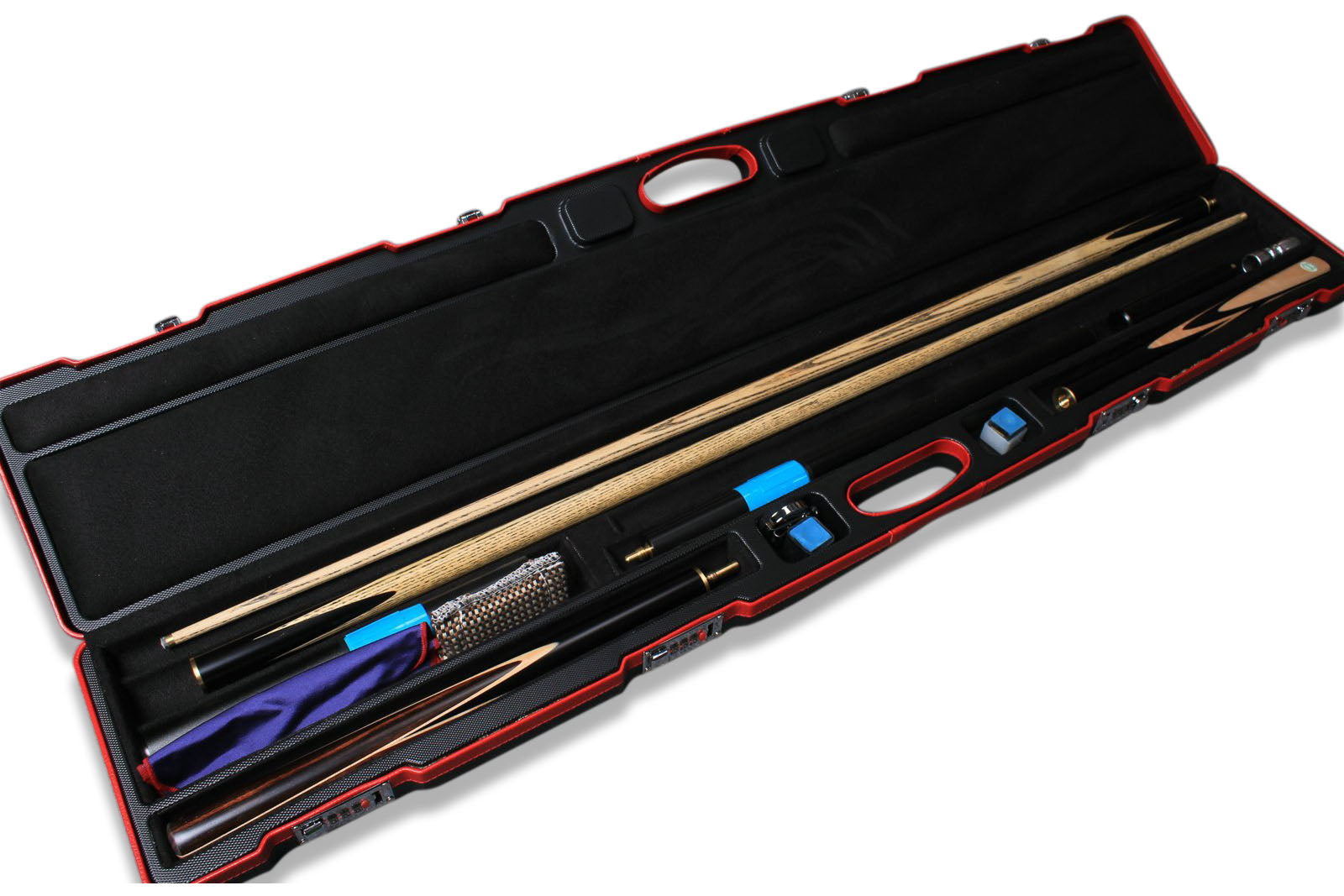 The interior of the case features four dedicated channels—two of which run the full length, ideal for storing standard 3/4 jointed full-size cues. The remaining shorter channels, along with the storage compartments on either side of the handle, are perfect for housing butt sections and cue extensions. This smart layout allows the case to comfortably accommodate two standard full 3/4 jointed cues while still offering space for additional accessories.