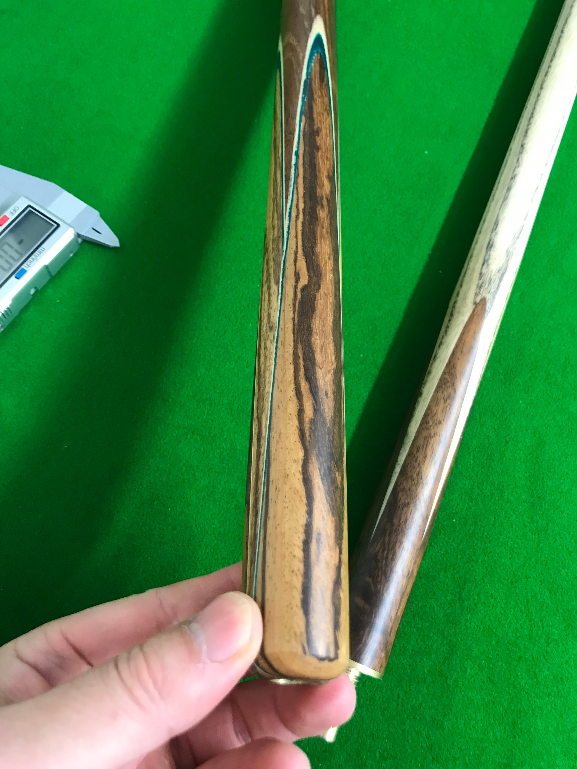 This is a really really nice example of a handmade and hand spliced Snooker cue. The cue is made by Michael's cues. The shaft is stiff straight grained well seasoned Ash hand spliced into rosewood with 4 splices of Zebrano wood. The cue is supplied with a 6" solid matching rosewood mini butt.
