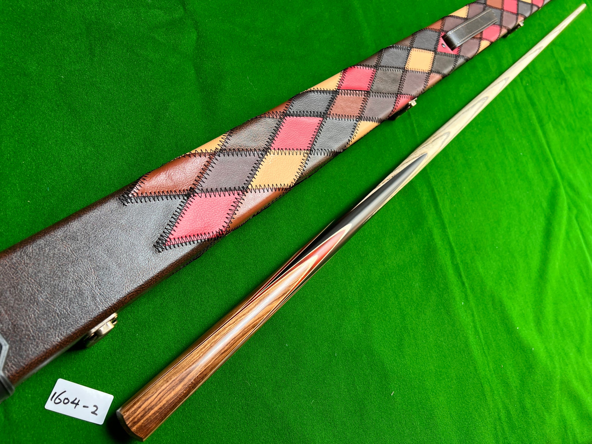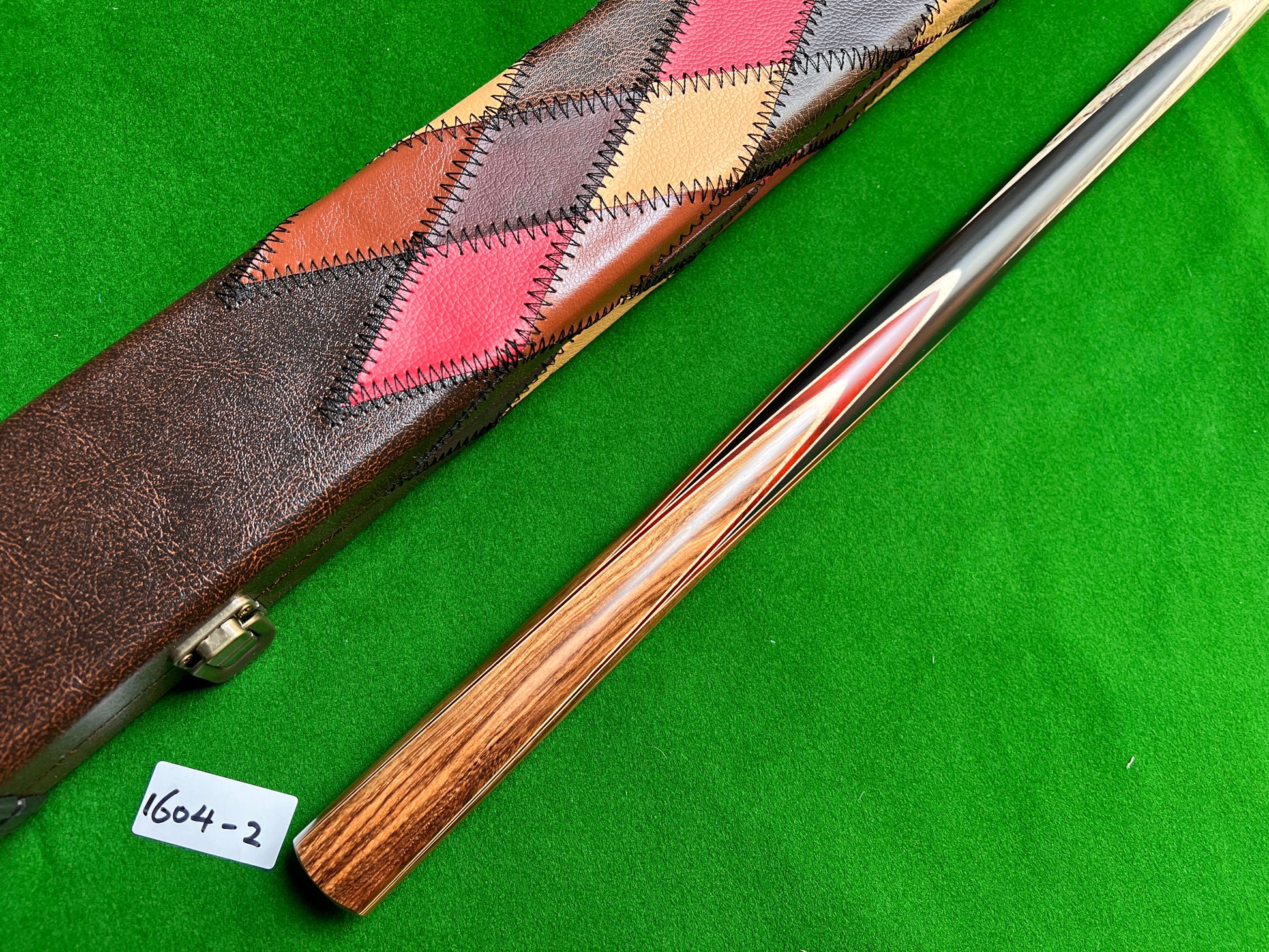 A nice example of a handmade and hand spliced 1pc Snooker cue. The shaft is well seasoned Ash hand spliced into black Ebony wood with all level splices and the chevrons face upwards. . You will not find a better value for money cue than this anywhere.