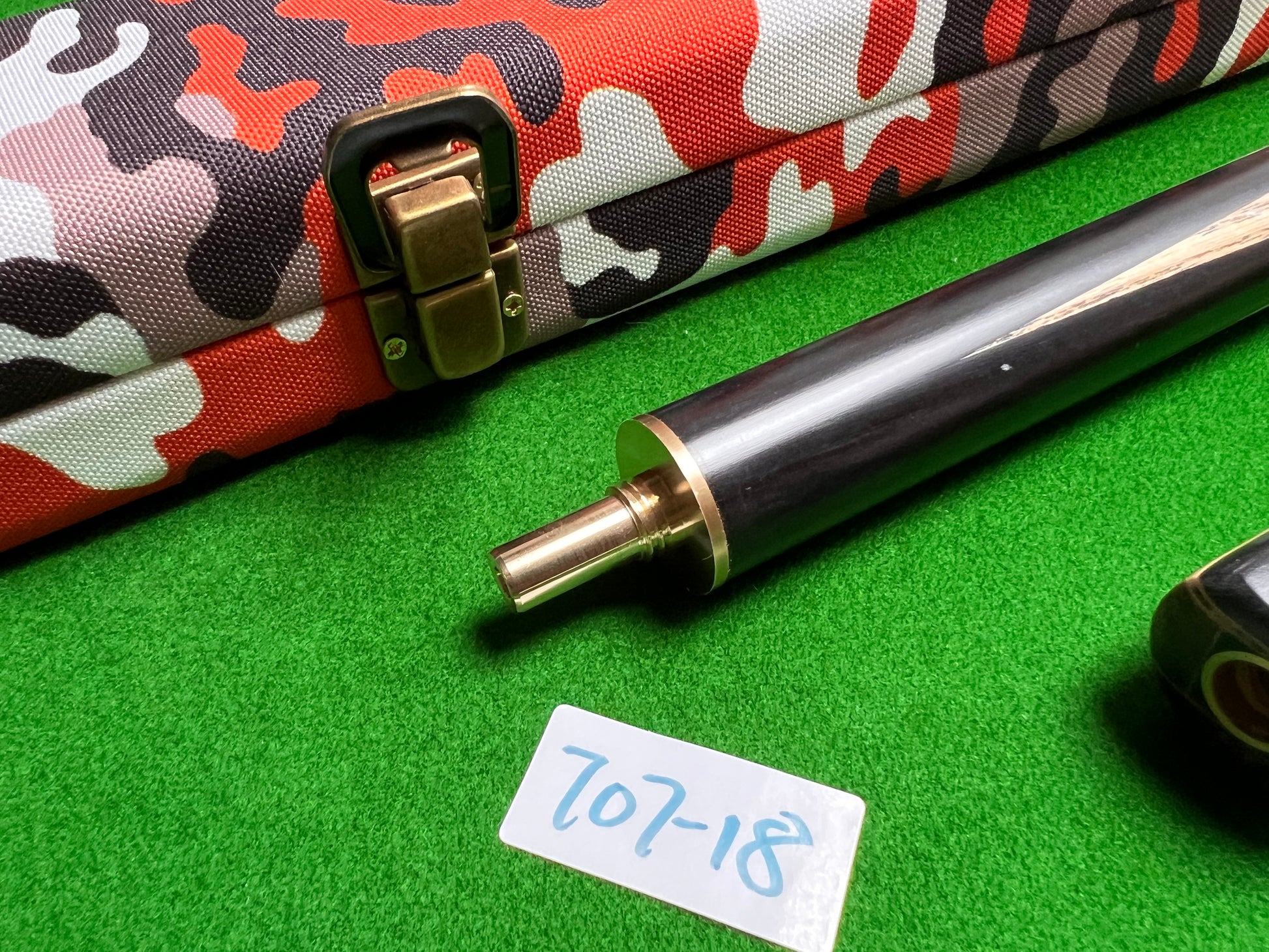 A nice example of a handmade and hand spliced cue. The shaft is well seasoned Ash hand spliced into black Ebony wood with all level splices and the chevrons face upwards. . You will not find a better value for money cue than this anywhere.